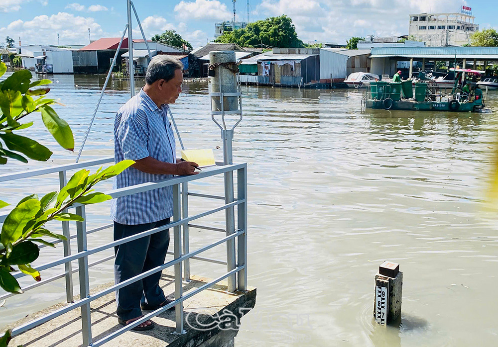 Ông Tăng Văn Thành đo mực nước trên sông Gành Hào.