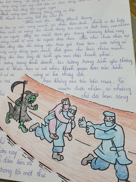 Một trang viết với hình ảnh minh họa về dịch bệnh COVID-19 gây xúc động tại cuộc thi Đại sứ văn hóa đọc năm 2022 tỉnh Bạc Liêu. Ảnh: C.T