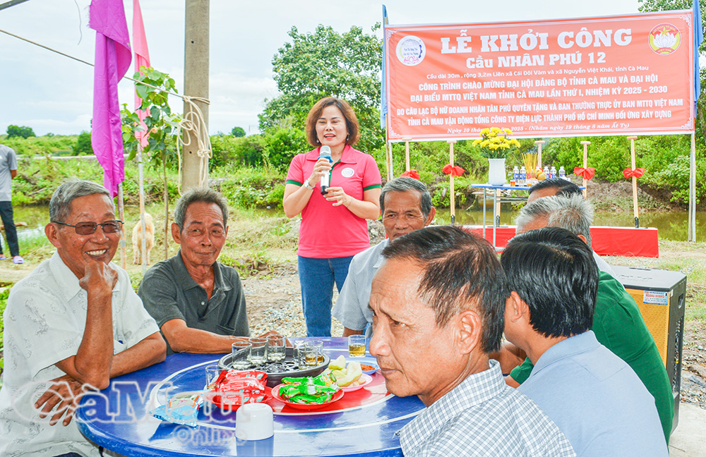 Phát biểu tại buổi lễ, Phó Chủ tịch Uỷ ban MTTQ Việt Nam tỉnh Võ Thị Ngọc Hân bày tỏ lòng cảm ơn sâu sắc đến các đơn vị tài trợ đã đồng hành cùng địa phương trong việc xây dựng cầu giao thông nông thôn. Bà Võ Thị Ngọc Hân nhấn mạnh: “Cây cầu sau khi hoàn thành sẽ góp phần rút ngắn khoảng cách đi lại, tạo thuận lợi trong lưu thông hàng hoá, kết nối giao thương giữa xã Cái Đôi Vàm và Nguyễn Việt Khái, từ đó thúc đẩy phát triển kinh tế - xã hội, nâng cao đời sống người dân”.