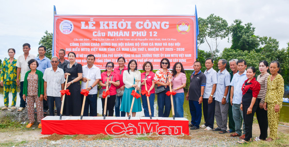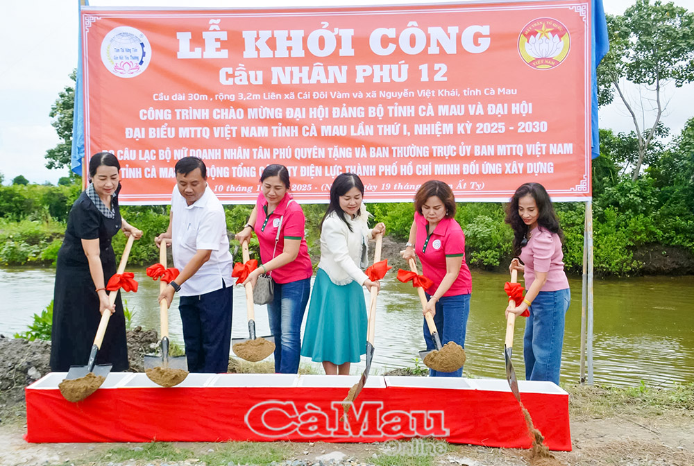 Báo Cà Mau Ngày 10/10, tại ấp Tân Quảng Tây, xã Cái Đôi Vàm, Uỷ ban MTTQ Việt Nam tỉnh Cà Mau phối hợp với Câu lạc bộ Nữ doanh nhân Tân Phú (TP Hồ Chí Minh) và chính quyền địa phương tổ chức Lễ khởi công xây dựng cầu giao thông nông thôn Nhân Phú 12.