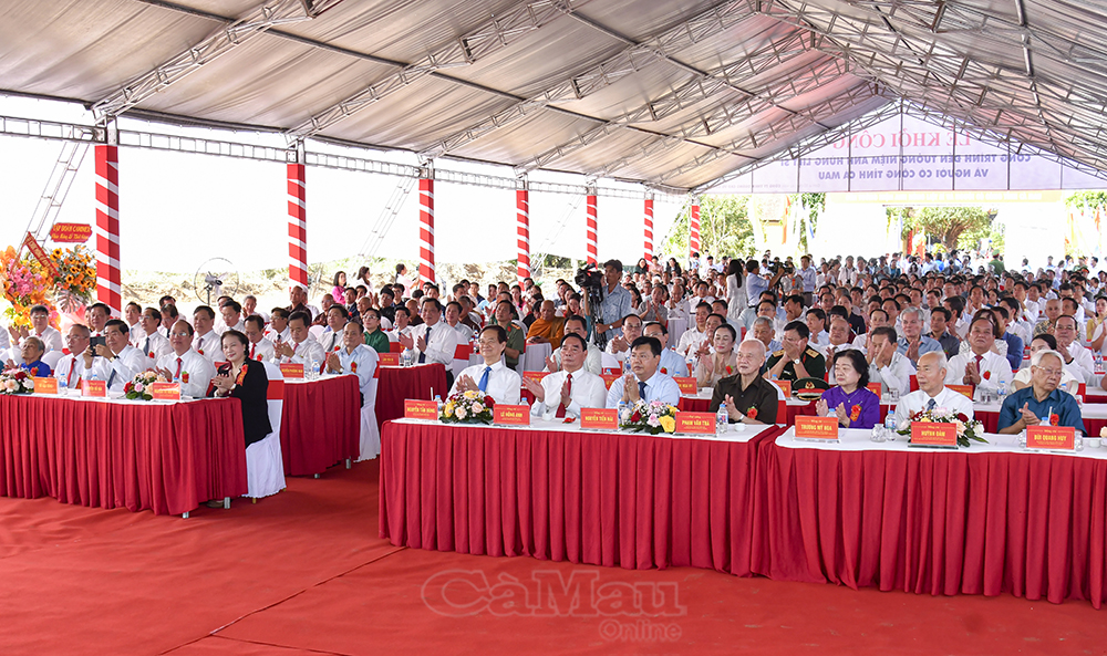Các đồng chí nguyên lãnh đạo Đảng, Nhà nước; lãnh đạo tỉnh Cà Mau cùng đông đảo người dân dự lễ khởi công.