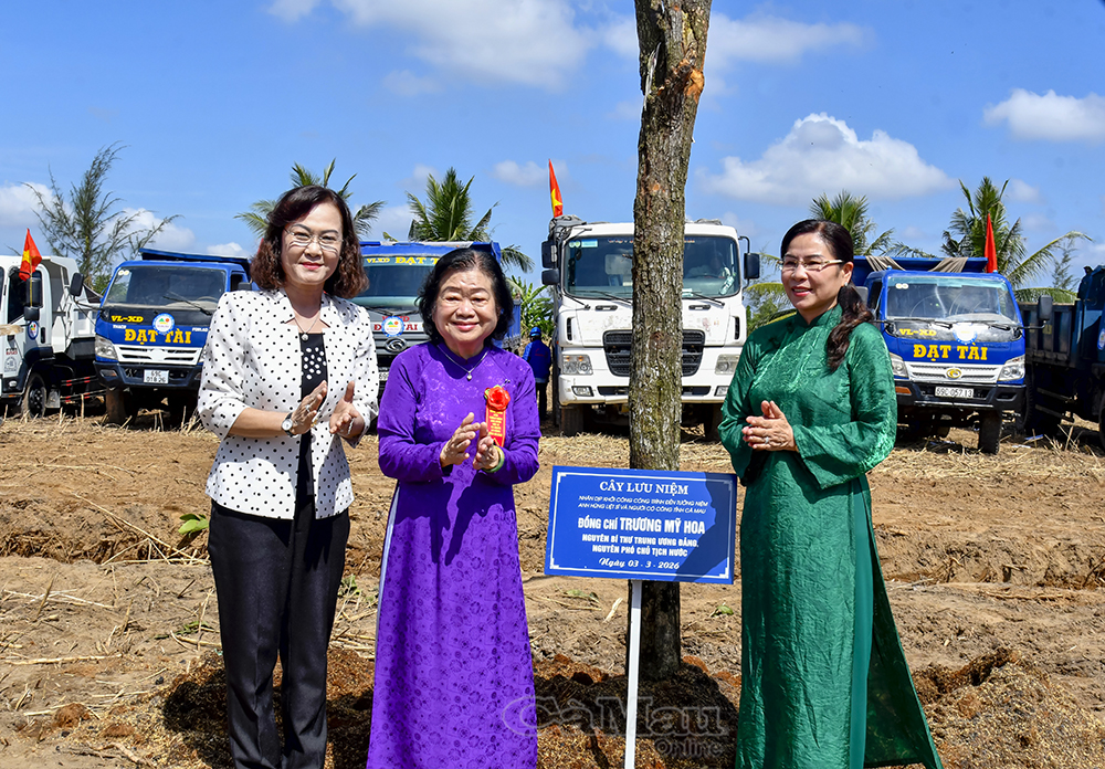 Đồng chí Trương Mỹ Hoa, nguyên Bí thư Trung ương Đảng, nguyên Phó Chủ tịch nước (giữa) cùng lãnh đạo và nguyên lãnh đạo tỉnh trồng cây lưu niệm trong khu vực dự án Đền tưởng niệm Anh hùng liệt sĩ và người có công tỉnh Cà Mau.