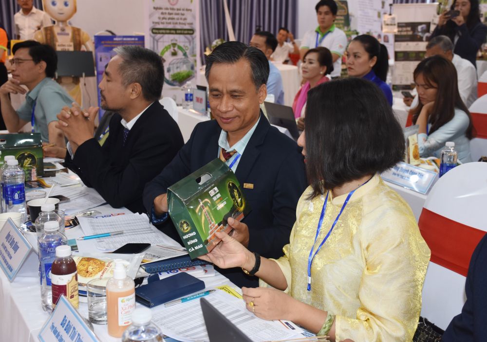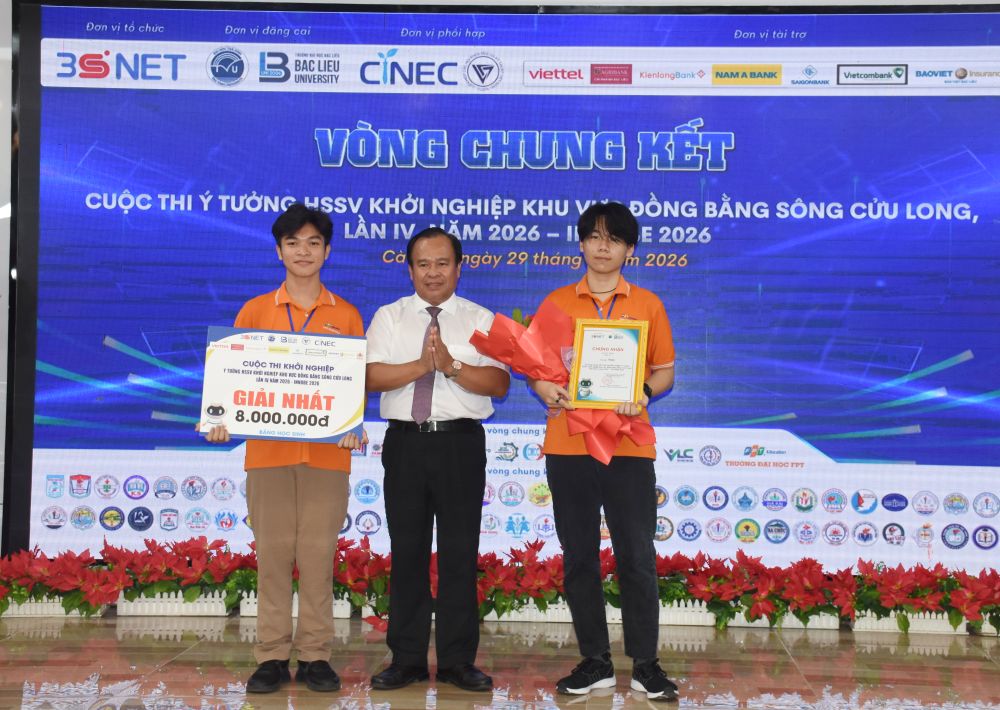 PGS. TS Tiền Hải Lý (thứ hai, từ trái sang), Phó Hiệu trưởng Trường Đại học Bạc Liêu và TS Nguyễn Văn Thành, Hiệu trưởng Trường Đại học Kiên Giang, trao giải Ba cho ý tưởng “Dự án đặc sản muối cá rau sam biển Cà Mau” của Trường Đại học Bạc Liêu.