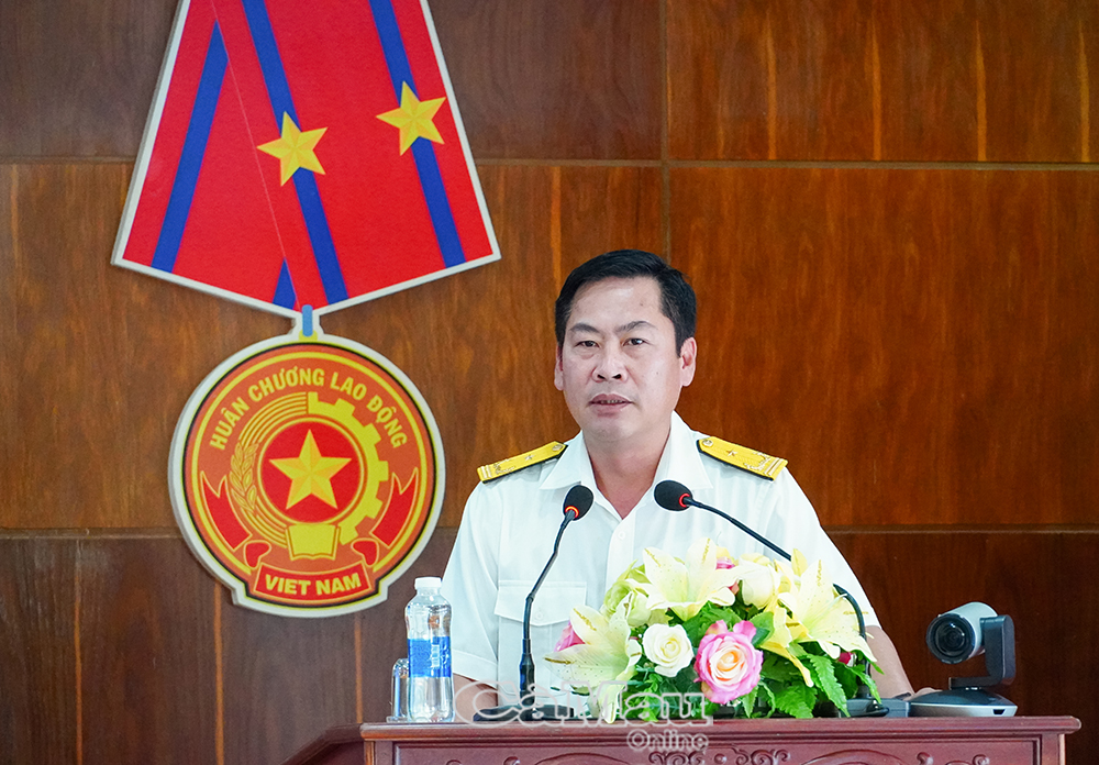 Ông Nguyễn Hữu Tuấn, Trưởng phòng Nghiệp vụ, Dự toán, Pháp chế, Thuế tỉnh Cà Mau, báo cáo kết quả công tác trao thưởng của Chương trình “Hoá đơn may mắn” trong các kỳ Quý I và Quý II/2025.
