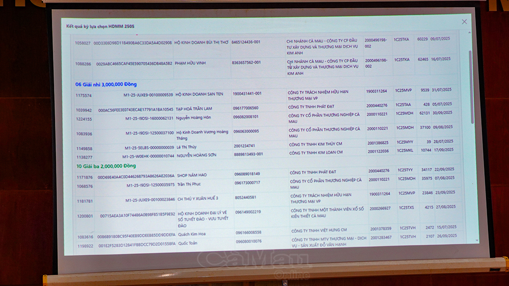 Đối với chương trình quay thưởng kỳ Quý III và Quý IV/2025, theo thống kê của Thuế tỉnh Cà Mau, trong 6 tháng cuối năm 2025, toàn tỉnh đã ghi nhận gần 411.500 hoá đơn điện tử có mã của cơ quan thuế. Trong đó, Quý III ghi nhận tổng số 210.787  hoá đơn; Quý IV với 200.628 hoá đơn. Đặc biệt, có gần 396.500 hoá đơn của người mua là cá nhân, hộ kinh doanh đáp ứng đầy đủ các tiêu chí để tham gia chương trình “Hoá đơn may mắn”.