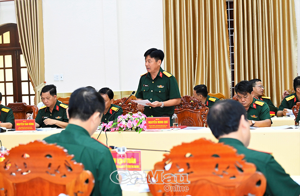 Đại tá Nguyễn Minh Quí, Phó Chỉ huy trưởng, kiêm Tham mưu trưởng báo cáo kết quả công tác PKND của tỉnh Cà Mau với đoàn kiểm tra.