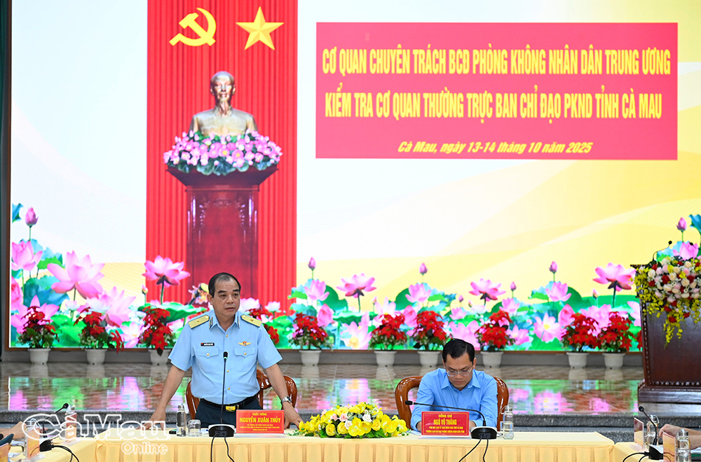 Báo Cà Mau Trong hai ngày 13-14/10, Đoàn công tác Cơ quan chuyên trách Ban Chỉ đạo Phòng không Nhân dân (PKND) Trung ương do Thiếu tướng Nguyễn Xuân Thuỷ, Cục trưởng Cục Phòng không Lục quân, làm Trưởng đoàn, đã đến kiểm tra công tác Phòng không Nhân dân tại Ban Chỉ huy PTKV 2 - Thới Bình, phường Tân Thành và Bộ Chỉ huy Quân sự (CHQS) tỉnh Cà Mau.