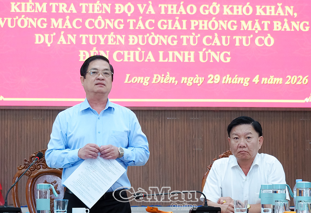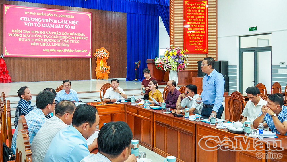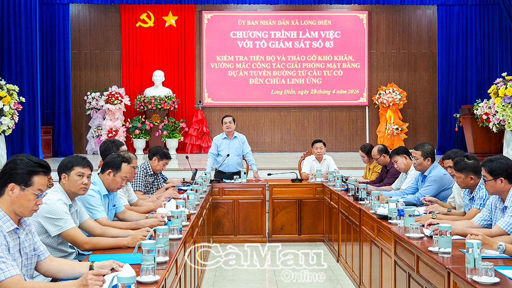 Sáng 29/4, Tổ giám sát số 3 do đồng chí Huỳnh Chí Nguyện, Phó Chủ tịch UBND tỉnh Cà Mau, dẫn đoàn đến kiểm tra tiến độ và tháo gỡ khó khăn trong thực hiện dự án xây dựng tuyến đường từ cầu Tư Cồ đến chùa Linh Ứng, xã Long Điền.