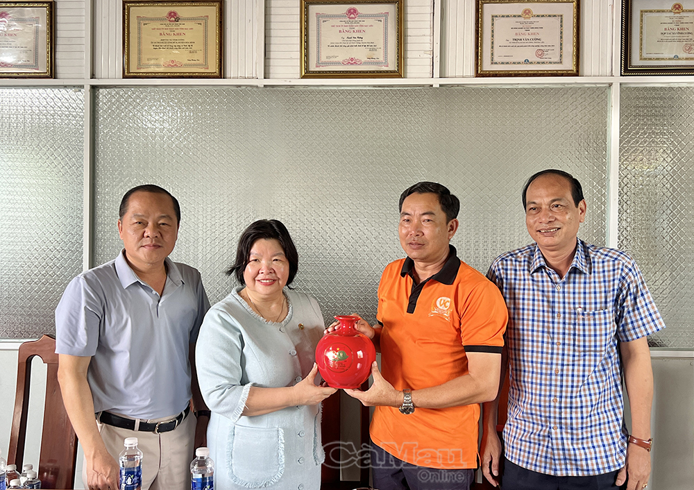 Bà Cao Xuân Thu Vân, Chủ tịch Liên minh Hợp tác xã Việt Nam, thăm và tặng quà chúc mừng HTX Nông nghiệp Vĩnh Cường đạt danh hiệu “Ngôi sao HTX”.