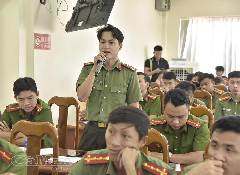 Đại uý Huỳnh Quang Nhựt (Ban Thanh niên Công an tỉnh) trao đổi về kỹ năng định hướng dư luận trên không gian mạng.