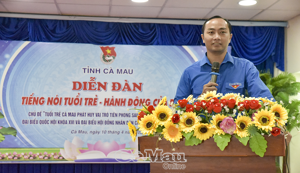 Phó Chủ tịch Uỷ ban MTTQ Việt Nam tỉnh Cà Mau, Bí thư Tỉnh đoàn Phạm Tuấn Tài phát biểu tại diễn đàn.