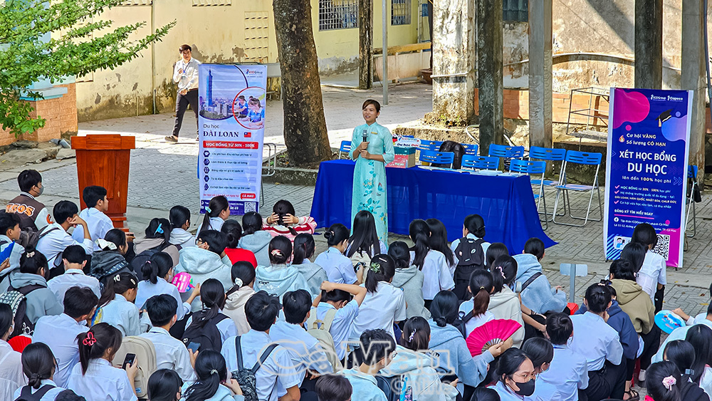 Bà Mai Kiều Oanh, Tổng Giám đốc Công ty CP Giáo dục Quốc tế Capeco, Phó Chủ tịch Hội Doanh nhân trẻ tỉnh Cà Mau, tư vấn hướng nghiệp cho học sinh Trường THPT Võ Thị Hồng, xã Ðá Bạc.