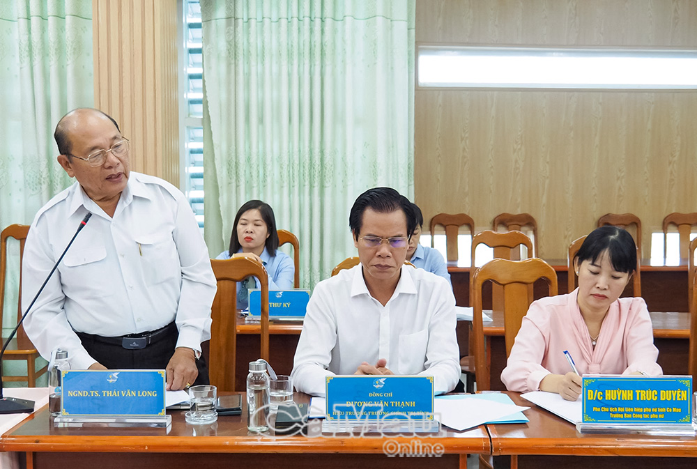 Nhà giáo Nhân dân, Tiến sĩ Thái Văn Long phát biểu đóng góp ý kiến vào Dự thảo Văn kiện Đại hội Đảng toàn quốc lần thứ XIV và Đại hội Đại biểu Đảng bộ tỉnh Cà Mau lần thứ I, nhiệm kỳ 2025 - 2030. (Ảnh: Loan Phương)
