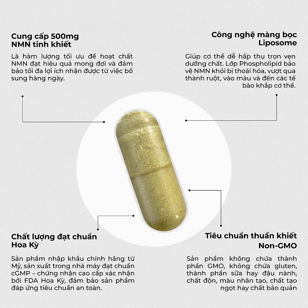Nhờ NMN và các chất chống oxy hóa đi kèm, sản phẩm giúp tăng cường sản xuất năng lượng, hỗ trợ sửa chữa ADN, cải thiện sức khỏe tim mạch, não bộ, tăng sức đề kháng, giảm mệt mỏi và cải thiện giấc ngủ. Công thức này được thiết kế để người dùng có thể chủ động chăm sóc cơ thể từ bên trong, duy trì sức khỏe và sự trẻ trung theo thời gian.