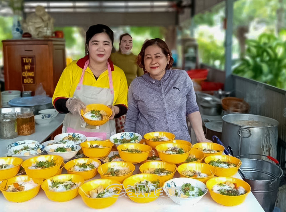Bà Hạnh cùng các thành viên nhóm cơm chay miễn phí Diệu Hoà nấu bún tặng người nghèo.