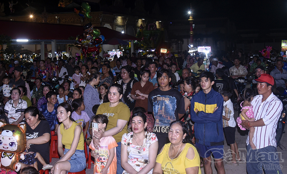 Đông đảo khán giả xã Hưng Hội đến chùa Cái Giá Chót thưởng thức chương trình nghệ thuật do Đoàn nghệ thuật tổng hợp Khmer Bạc Liêu trình diễn.