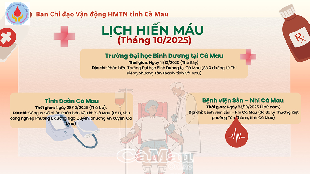 Lịch Hiến máu tình nguyện tháng 10/2025 tại Cà Mau.