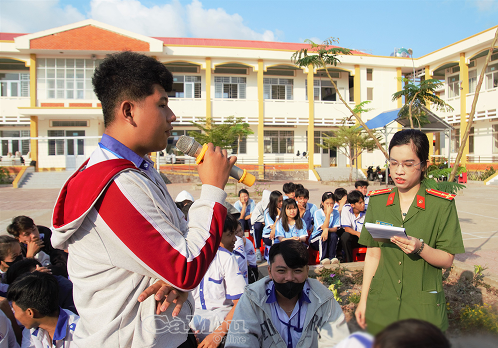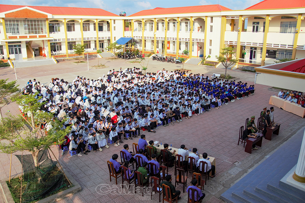 Hơn 650 học sinh và cán bộ, giáo viên Trường THPT Ngọc Hiển (Xã Phan Ngọc Hiển) được tuyên truyền pháp luật thông qua phiên toà giả định.
