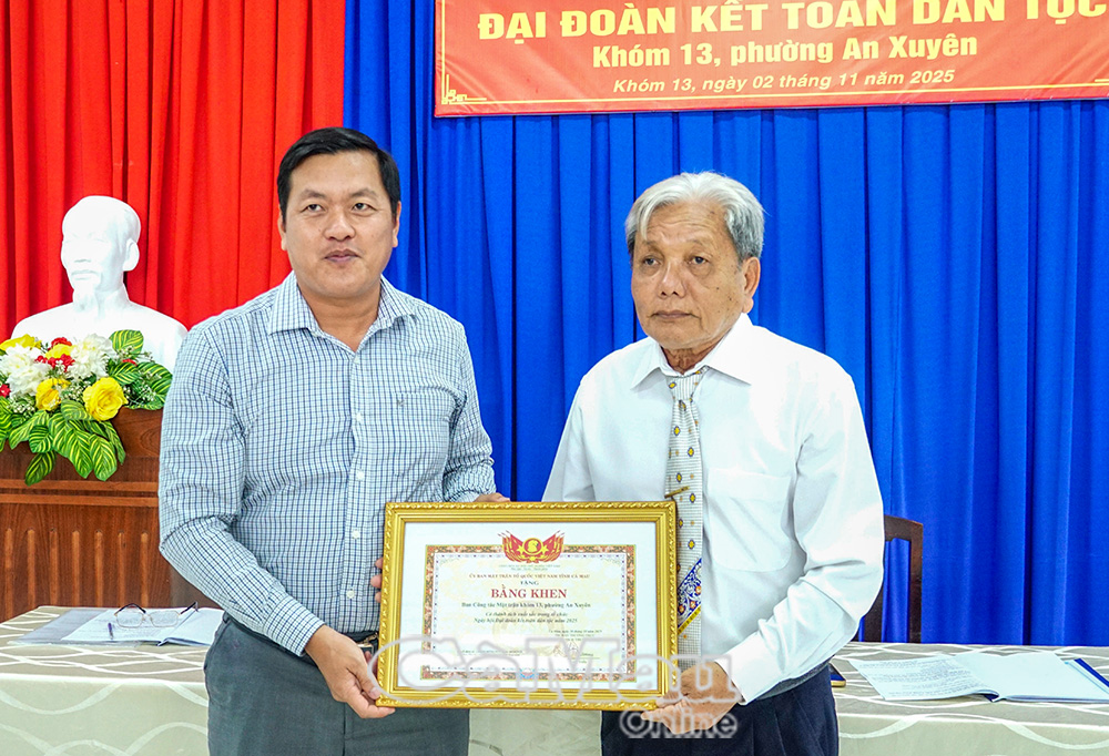 Ban Công tác mặt trận Khóm 13 nhận bằng khen của Uỷ ban MTTQ Việt Nam tỉnh Cà Mau vì có thành tích xuất sắc trong việc tổ chức Ngày hội đại đoàn kết toàn dân tộc năm 2025.