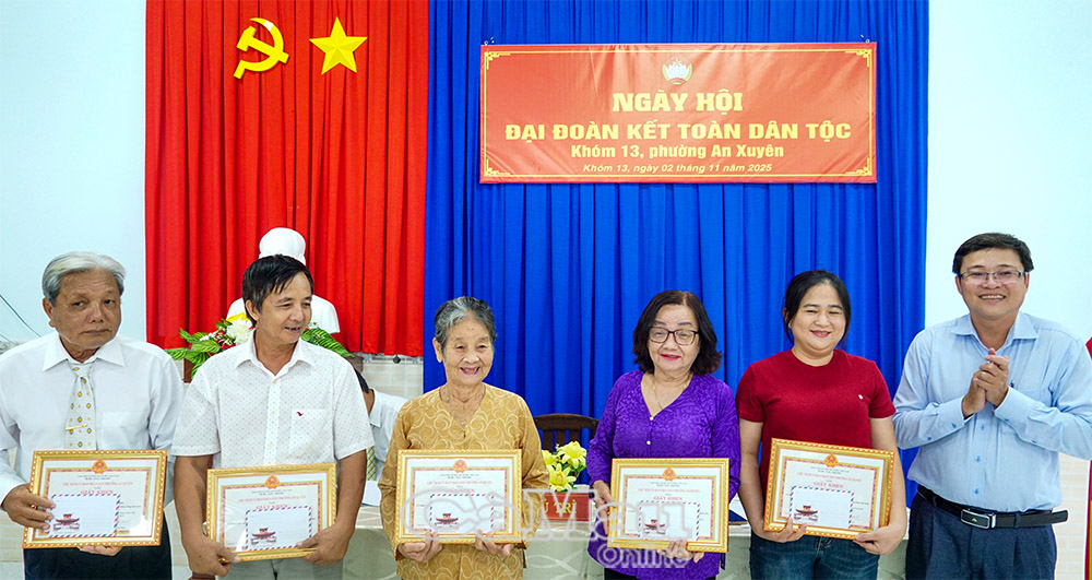 Dịp này, Uỷ ban MTTQ Việt Nam tỉnh Cà Mau tặng Bằng khen cho tập thể Khóm 13 vì có thành tích xuất sắc trong tổ chức Ngày hội Đại đoàn kết toàn dân tộc năm 2025; Phó Chủ tịch UBND tỉnh Ngô Vũ Thăng trao 5 suất quà cho hộ có hoàn cảnh khó khăn, lan tỏa tinh thần tương thân, tương ái trong cộng đồng.
