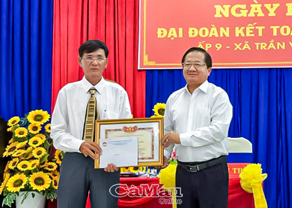 Đồng chí Lê Thanh Triều, Phó Chủ tịch Thường trực Uỷ ban MTTQ Việt Nam tỉnh Cà Mau trao bcằng khen về công tác tổ chức Ngày hội cho Ban công tác Mặt trận Ấp 9.