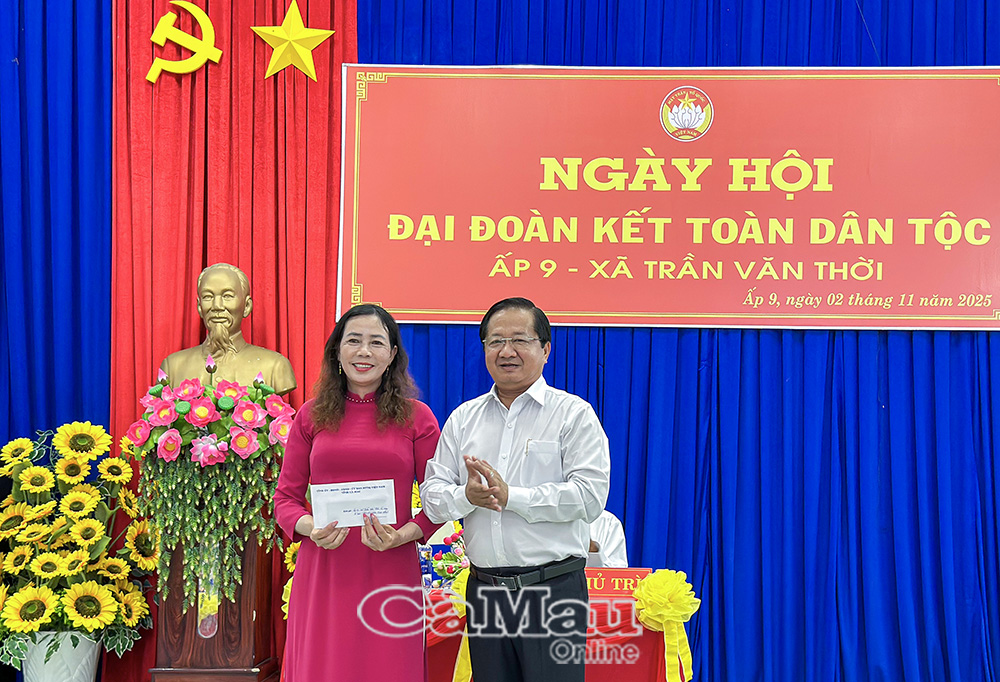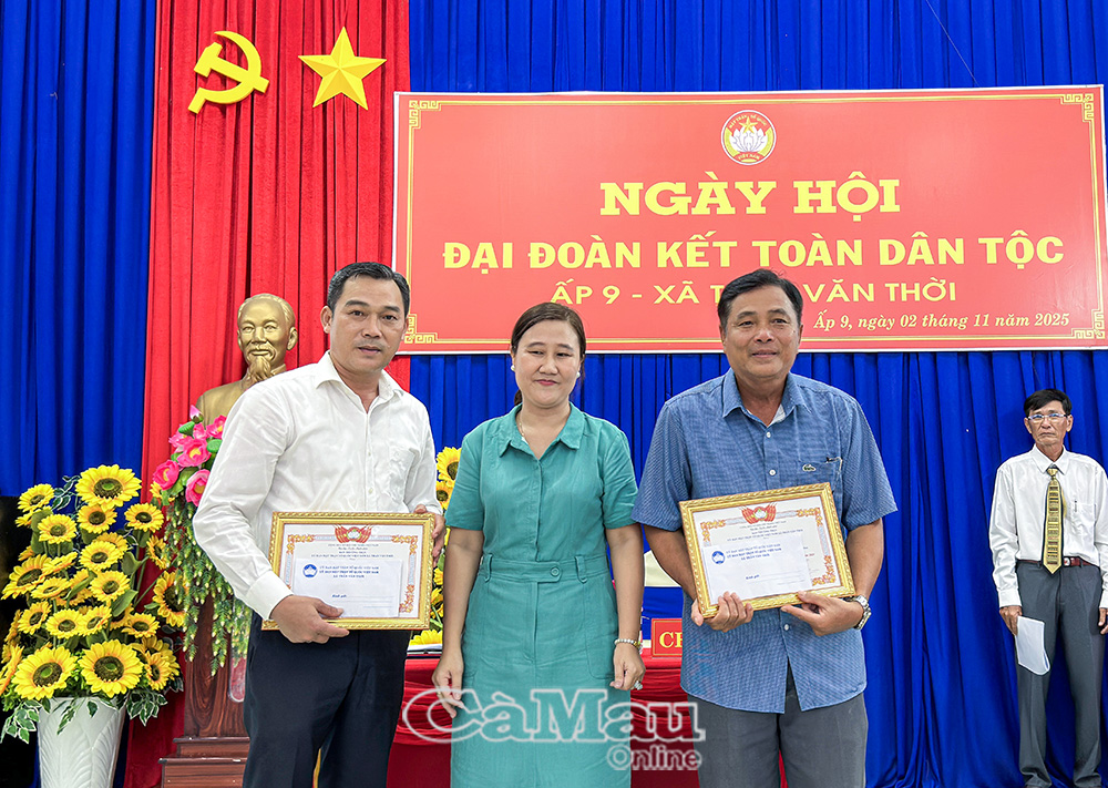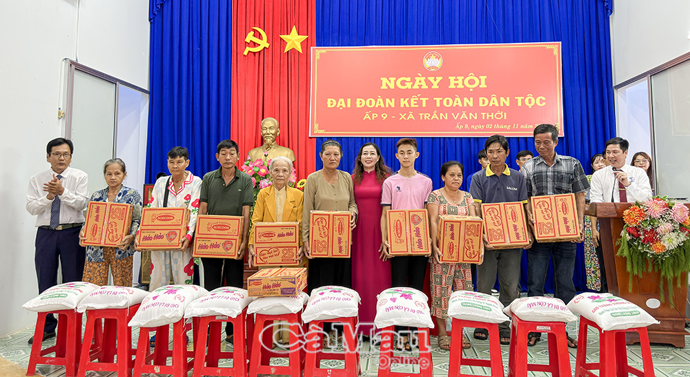 Nhân dịp này, Uỷ ban MTTQ Việt Nam tỉnh Cà Mau tặng bằng khen cho Ấp 9 về thành tích xuất sắc trong tổ chức Ngày hội Đại đoàn kết năm 2025 và 5 suất quà cho các hộ khó khăn. UBMTTQ xã Trần Văn Thời trao giấy khen cho 2 cá nhân tiêu biểu, đồng thời Ban CTMT Ấp 9 vận động trao 36 suất quà cho các hộ khó khăn, lan tỏa tinh thần tương thân tương ái trong cộng đồng.