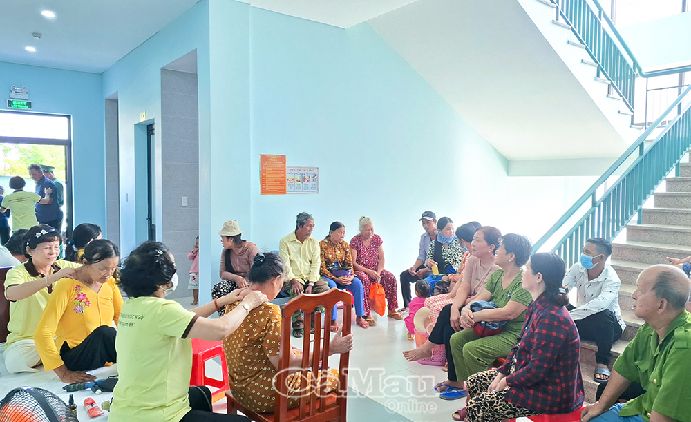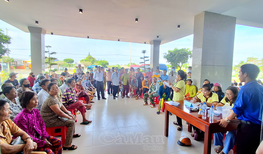 Đông đảo người dân của 16 khóm trên địa bàn đến chờ khám, chữa bệnh, cấp phát thuốc và nhận quà từ đoàn khám bệnh nhân đạo.