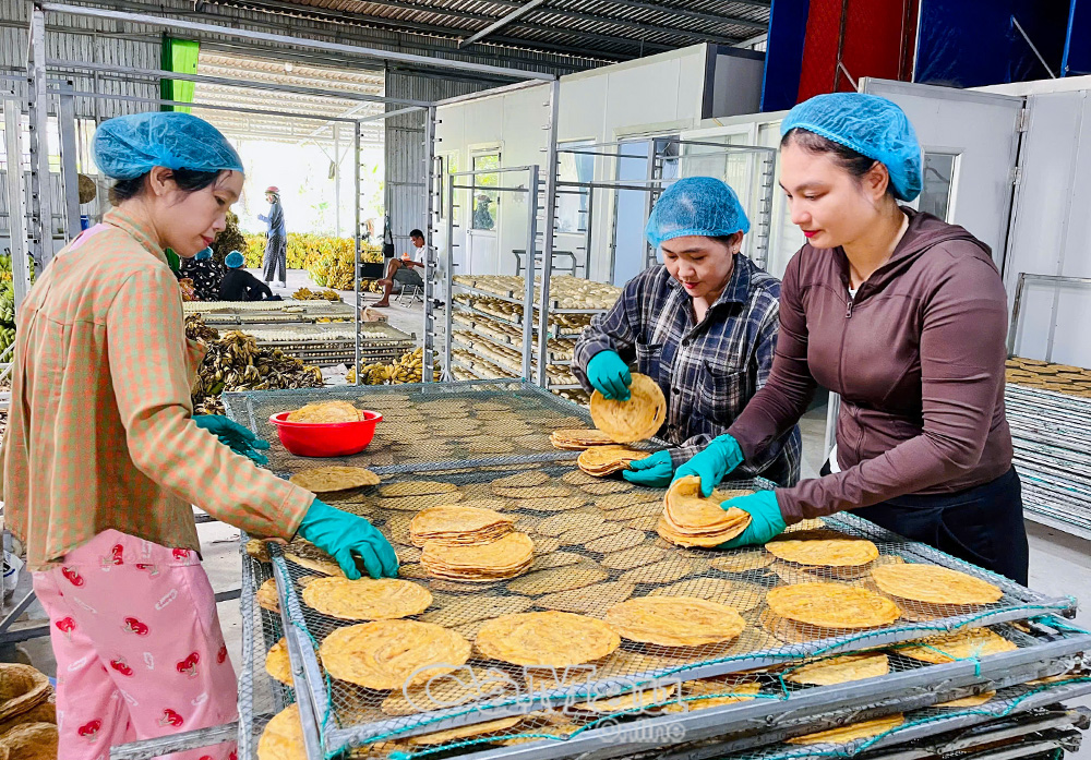 Công nhân tại một cơ sở chuối ép khô ở xã Khánh Hưng tất bật sắp xếp chuối vào khay, chuẩn bị cho công đoạn sấy, ép, nhằm kịp cung ứng phục vụ thị trường Tết Bính Ngọ 2026.