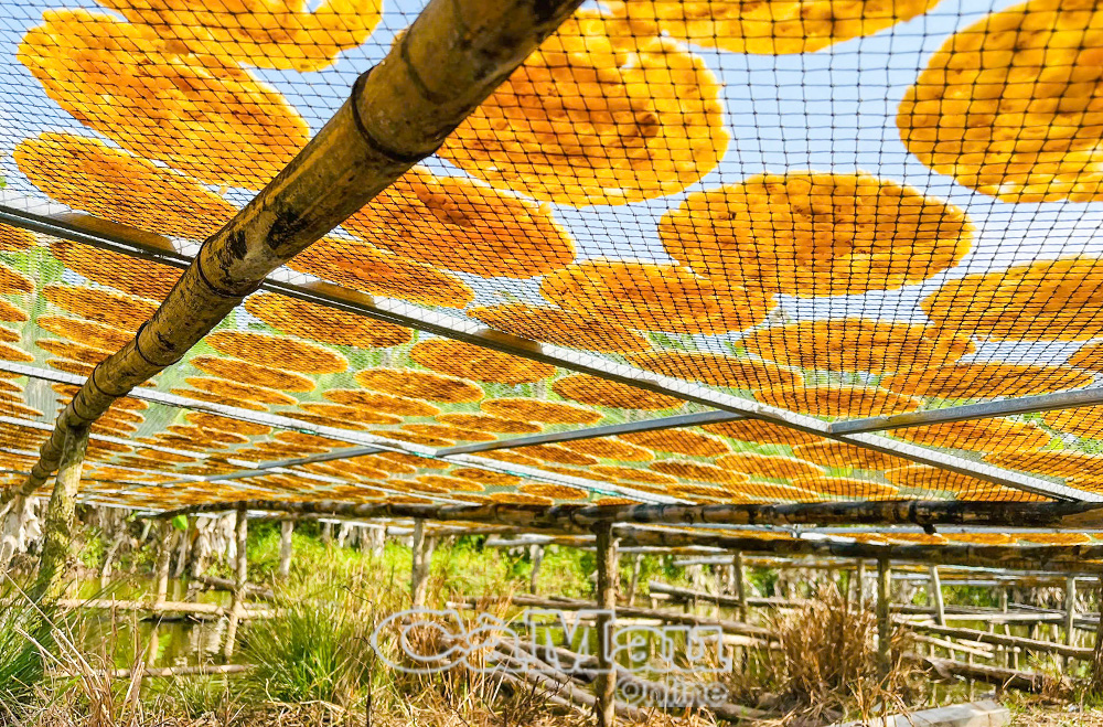Dưới trời nắng tốt, miếng chuối ép dần ngả màu vàng óng, tươm mật, dẻo thơm, giữ được vị ngọt tự nhiên.
