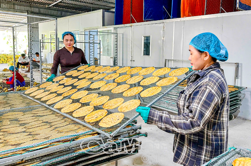 Chị Phạm Hồng Nghi, chủ cơ sở sản xuất chuối ép khô Ngọc Diệp (ấp Bình Minh 2, xã Khánh Hưng), chia sẻ: “Khi mới thành lập, cơ sở chủ yếu làm thủ công, dần dần đầu tư máy móc, tăng công suất. Kỹ thuật ép chuối khô không quá phức tạp, nhưng cái khó nhất là phụ thuộc thời tiết, gặp nắng tốt thì chuối phơi có màu vàng đẹp, còn thời tiết xấu thì chuối dễ ngả màu, chất lượng không đạt, khó bán ra thị trường”.
