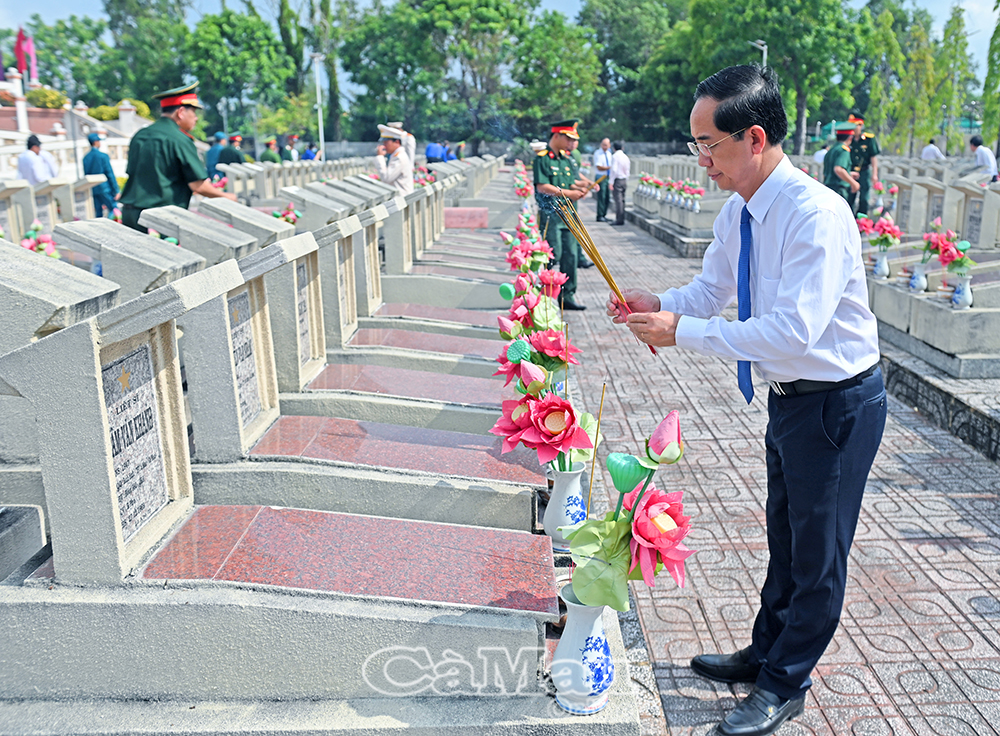 Trước Đài Tổ quốc ghi công tại Nghĩa trang Liệt sĩ tỉnh (phường An Xuyên), các đồng chí lãnh đạo tỉnh dâng hương, bày tỏ lòng tri ân sâu sắc trước những hy sinh to lớn của các thế hệ cha anh vì độc lập, tự do của dân tộc, vì hạnh phúc của Nhân dân.