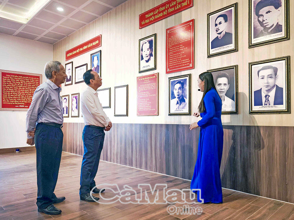 Đồng chí Phạm Văn Thiều, Phó Bí thư Tỉnh uỷ, Chủ tịch HĐND tỉnh và đồng chí Bùi Công Bửu, nguyên Phó Bí thư Thường trực Tỉnh uỷ, nguyên Chủ tịch HĐND tỉnh,. tham quan Nhà trưng bày di tích Tỉnh uỷ Lung Lá - Nhà Thể.