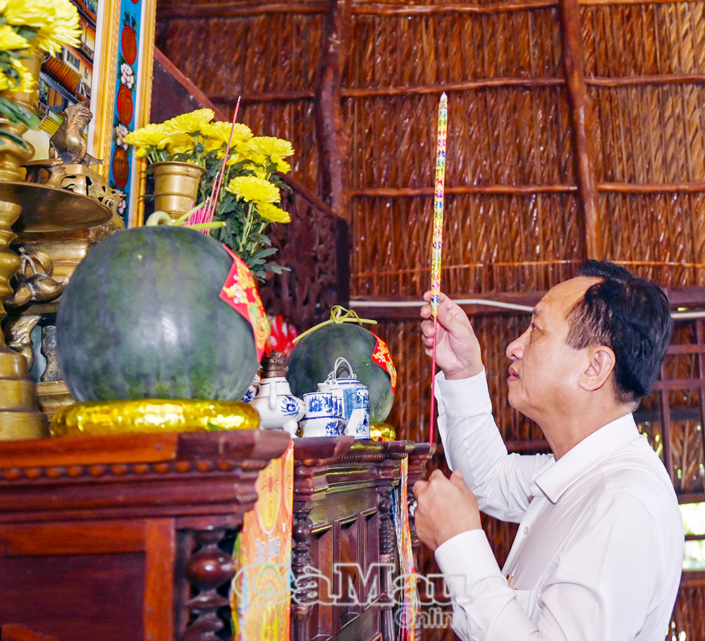 Đồng chí Phạm Văn Thiều thắp hương lên bàn thờ trong khu phục dựng nhà đồng chí Trần Văn Thời nằm trong khuôn viên Khu Di tích Tỉnh uỷ Lung Lá - Nhà Thể.