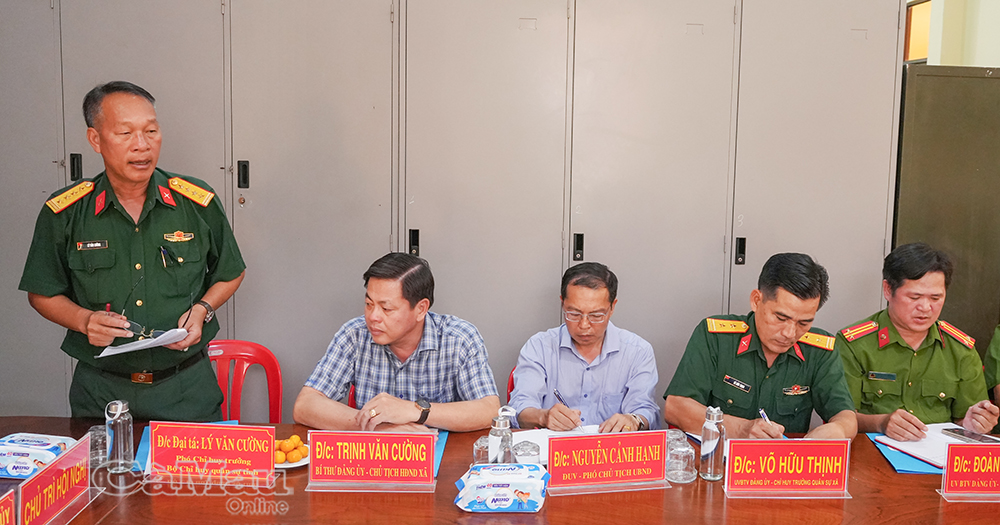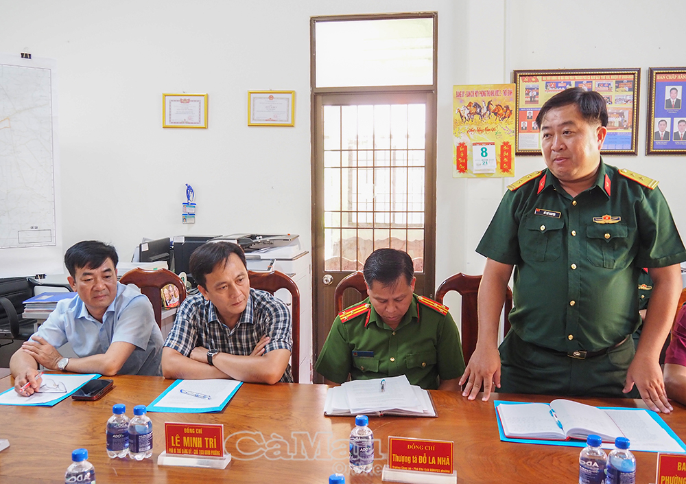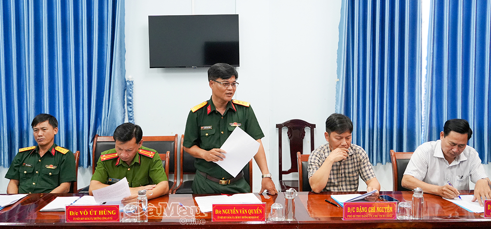 Trung tá Nguyễn Văn Quyển, Chỉ huy trưởng Ban CHQS xã Khánh Bình, báo cáo tại buổi làm việc.