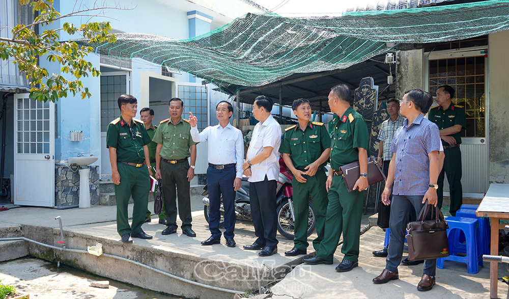 Phó Bí thư Tỉnh uỷ, Chủ tịch Uỷ ban MTTQ Việt Nam tỉnh Cà Mau Hồ Thanh Thuỷ (hàng đầu, thứ ba từ trái sang) cùng đoàn công tác tỉnh khảo sát tại trụ sở Ban CHQS xã Khánh Bình.