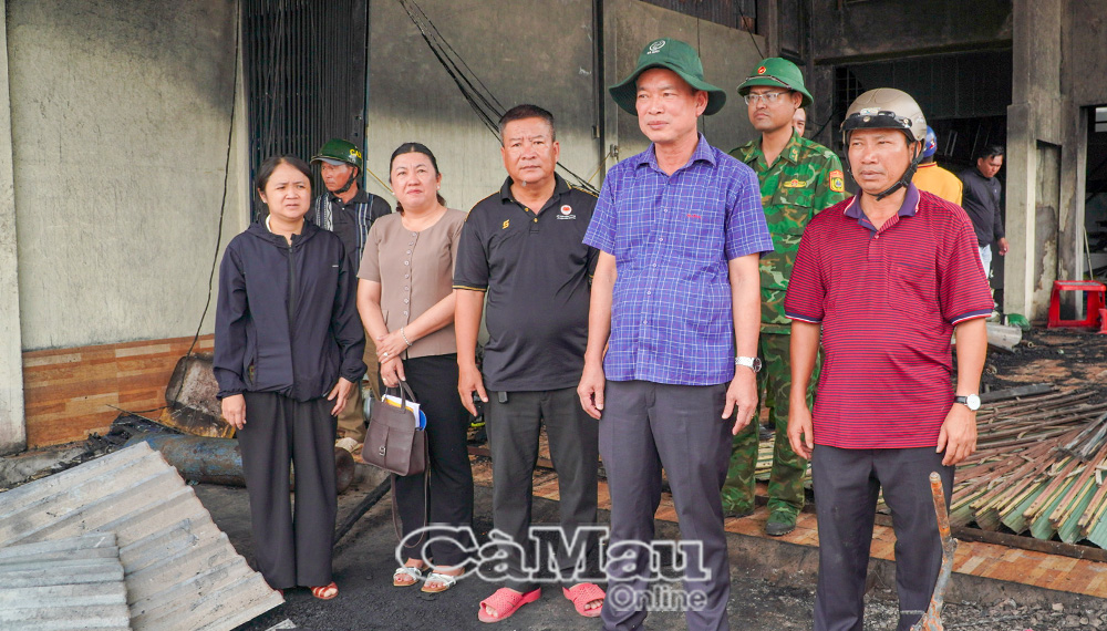 Đồng chí Nguyễn Văn Khởi, Phó Chủ tịch Uỷ ban MTTQ Việt Nam tỉnh Cà Mau (thú hai từ phải sang), trực tiếp khảo sát hiện trường vụ cháy.