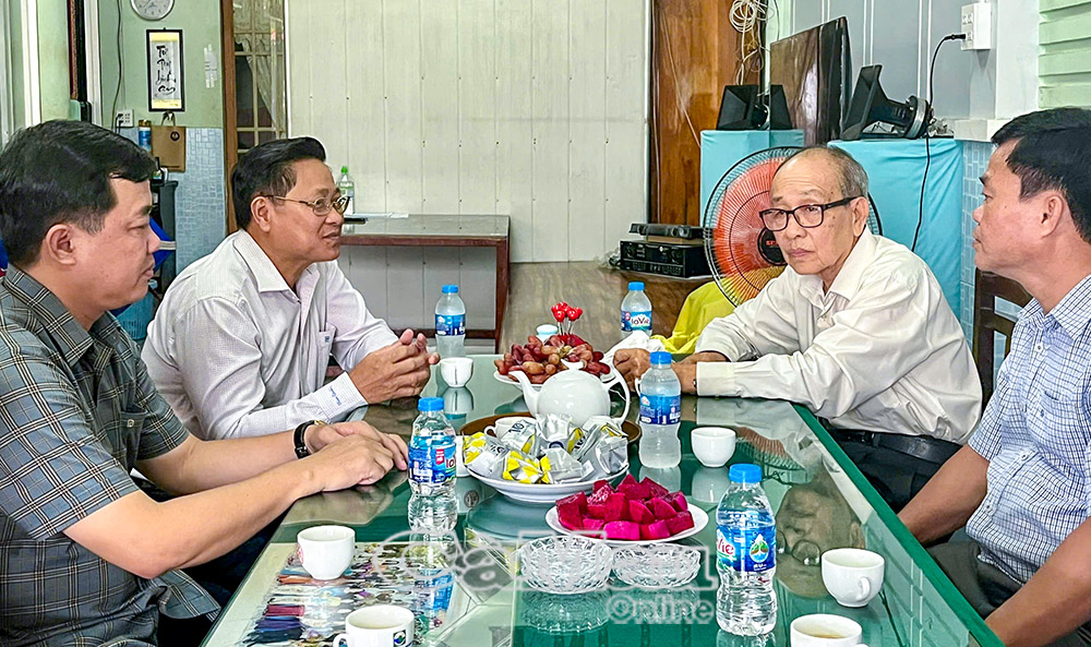 Phó Chủ tịch HĐND tỉnh Bùi Tấn Bảy (thứ hai từ trái sang) ân cần thăm hỏi sức khoẻ Nhà giáo ưu tú Trương Tấn Sĩ và gia đình.