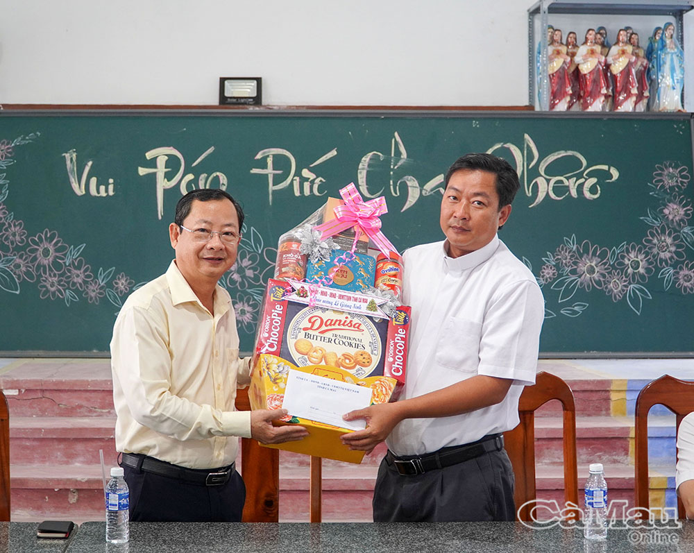 Giám đốc Sở Giáo dục và Đào tạo Nguyễn Văn Nguyên (bên phải) trao quà của Tỉnh uỷ - HĐND - UBND - Ủy ban MTTQ Việt Nam tỉnh Cà Mau tặng Giáo xứ Kinh Tư.