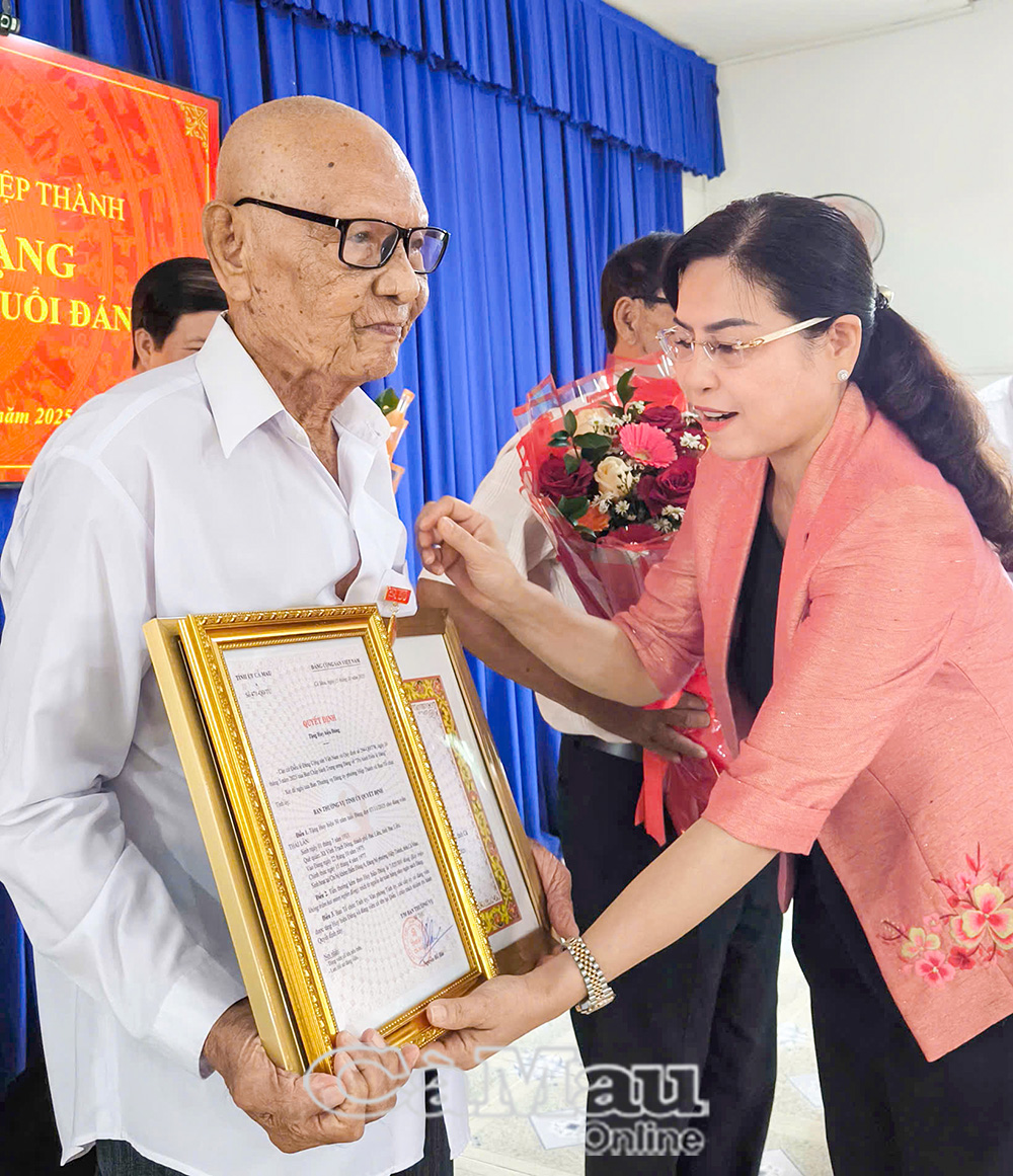 Đồng chí Lê Thị Nhung, Uỷ viên Ban Thường vụ Tỉnh uỷ, Phó Chủ tịch Thường trực HĐND tỉnh Cà Mau, trao Huy hiệu 50 năm tuổi Đảng cho đảng viên cao niên Thái Lân.