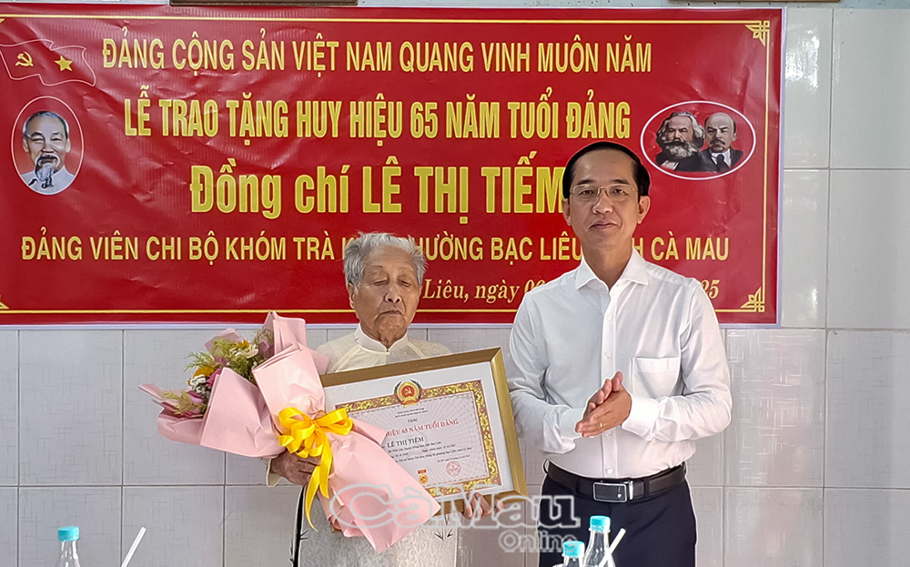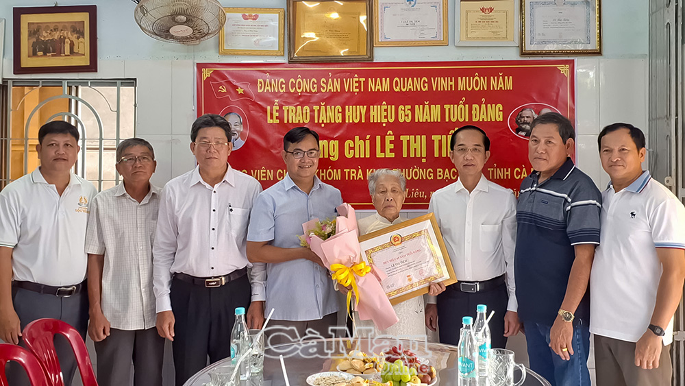 Đoàn đến nhà thăm và trao Huy hiệu 65 năm tuổi Đảng cho đồng chí Lê Thị Tiếm, sinh năm 1936, đảng viên Chi bộ khóm Trà Kha, nguyên Trưởng Khối vận Phường 8, thị xã Bạc Liêu (cũ). Trong những năm kháng chiến, đồng chí Lê Thị Tiếm từng đảm nhiệm nhiều cương vị như Xã đội trưởng, Bí thư Xã đoàn, Đội phó Giao liên và bị thương nặng trong khi làm nhiệm vụ.