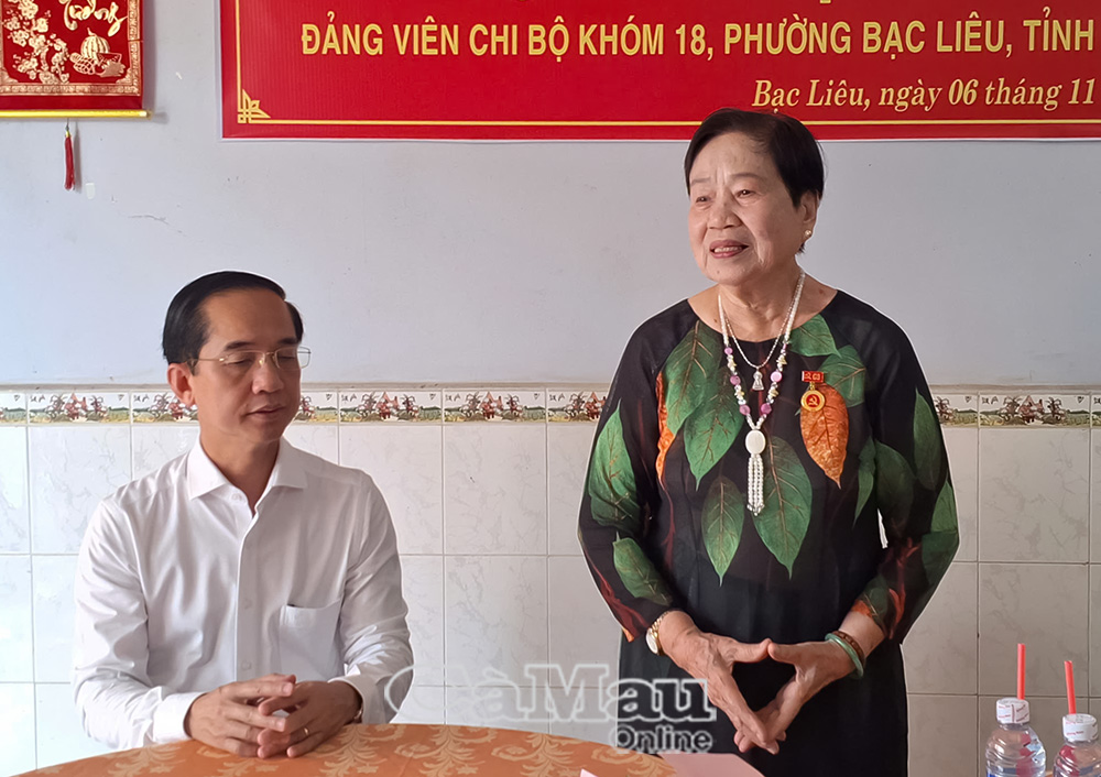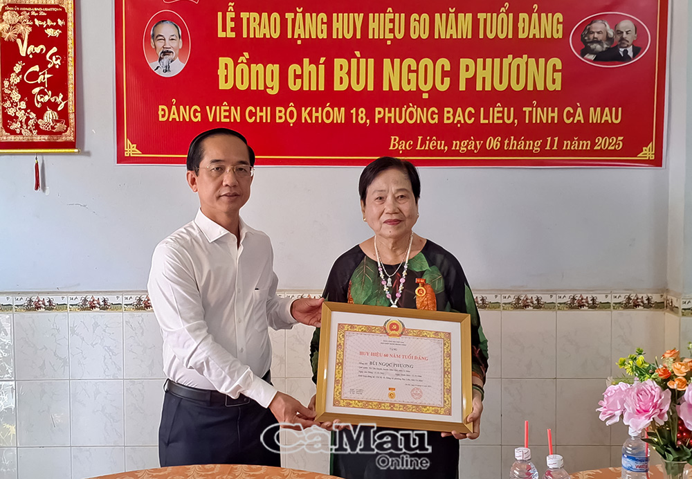 Cùng ngày, Đoàn đến nhà trao Huy hiệu 60 năm tuổi Đảng cho đồng chí Bùi Ngọc Phương, đảng viên Chi bộ Khóm 18, nguyên Hiệu trưởng Trường Trung học Y tế Bạc Liêu. Đồng chí Bùi Ngọc Phương tham gia cách mạng từ năm 15 tuổi với nhiệm vụ giao liên, sau đó lần lượt đảm nhiệm các chức vụ Phó Ban đấu tranh trực diện, Phân đoàn trưởng, Uỷ viên Ban Chấp hành Phụ nữ xã…