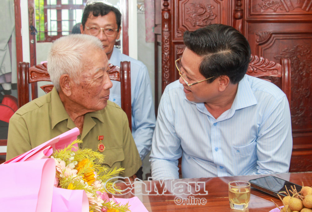 Đồng chí Bùi Tấn Bảy, Phó Chủ tịch HĐND tỉnh ân cần thăm hỏi đảng viên cao niên Nguyễn Phát Đạt.