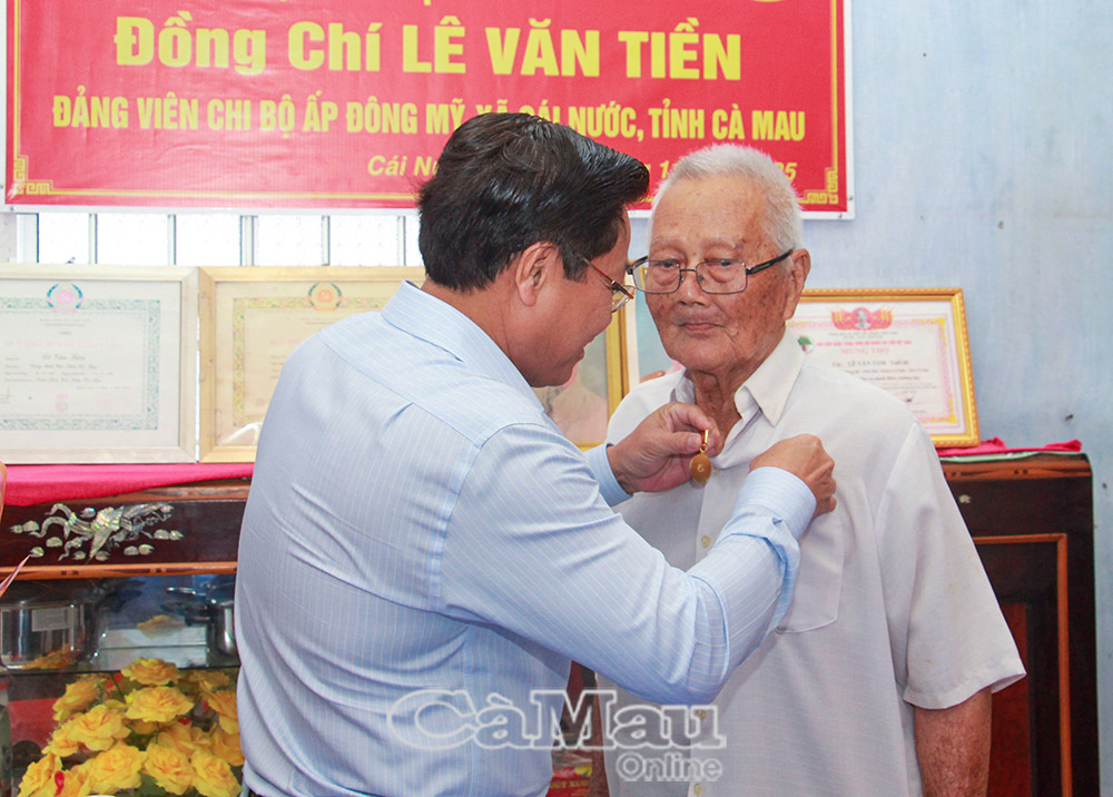 Đồng chí Bùi Tấn Bảy, Phó Chủ tịch HĐND tỉnh, trao Huy hiệu 65 năm tuổi Đảng cho đồng chí Lê Văn Tiền, Chi bộ ấp Đông Mỹ, xã Cái Nước.
