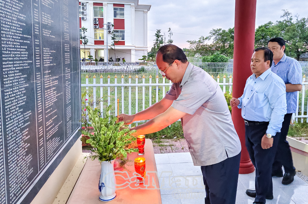 Trước buổi làm việc, Bí thư Tỉnh uỷ Nguyễn Hồ Hải và đoàn công tác viếng, thắp hương Bia ghi danh liệt sĩ xã Tân Thuận.