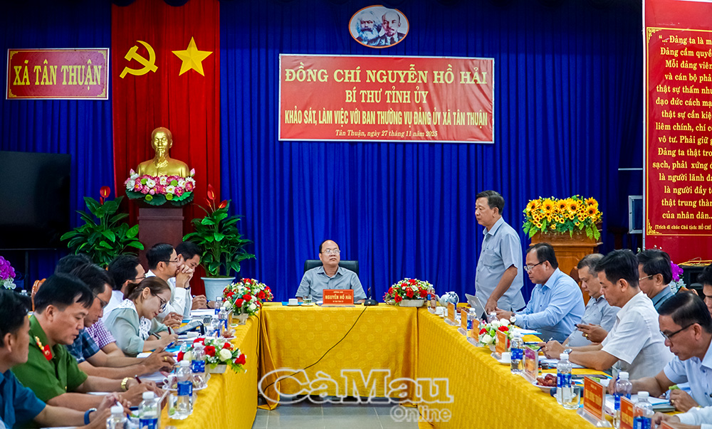“Phải lấy người dân làm trung tâm, mục tiêu và động lực trong mọi nhiệm vụ chính trị; chung sức, đồng lòng xây dựng xã Tân Thuận trở thành đô thị biển động lực phía Đông tỉnh Cà Mau, tương xứng tiềm năng và kỳ vọng", đồng chí Nguyễn Hồ Hải, Bí thư Tỉnh uỷ, nhấn mạnh tại buổi làm việc với lãnh đạo xã Tân Thuận vào chiều 27/11.