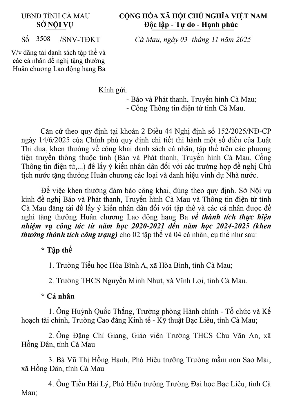 Sở Nội vụ tỉnh Cà Mau vừa có công văn đề nghị Báo và Phát thanh, Truyền hình Cà Mau và Cổng Thông tin điện tử tỉnh Cà Mau đăng tải thông tin về các tập thể, cá nhân được đề nghị Chủ tịch nước tặng thưởng Huân chương hạng Ba.