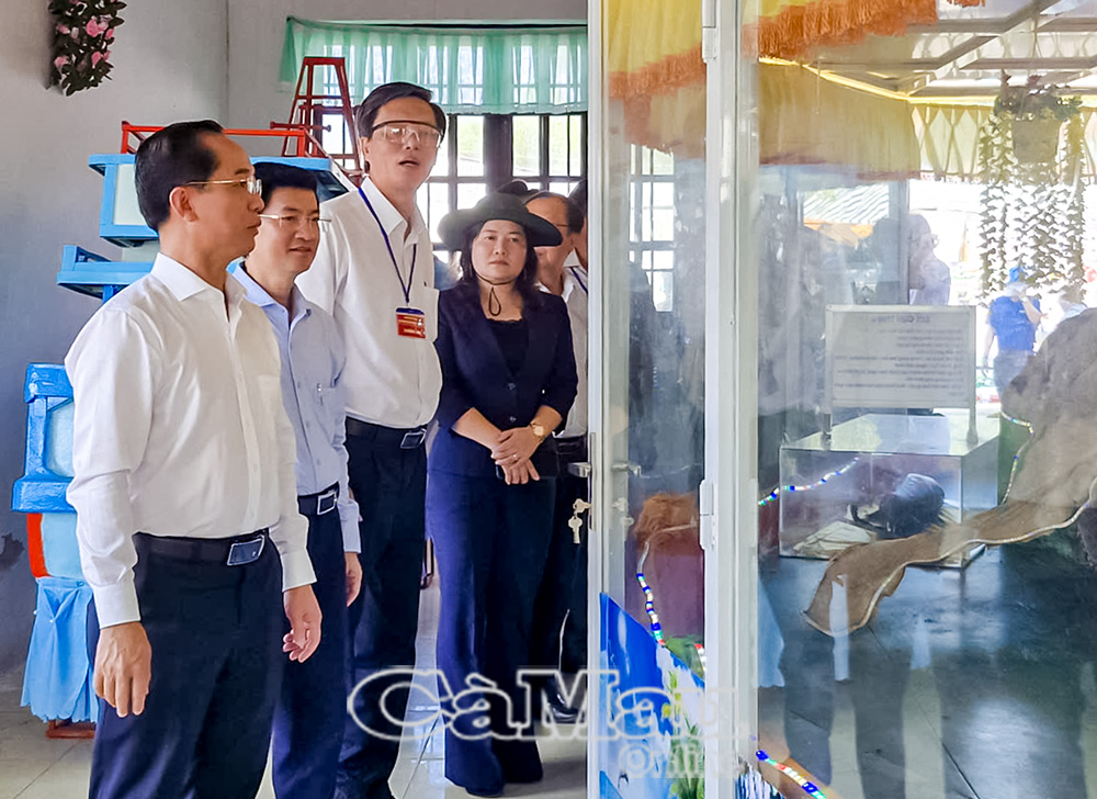 Đồng chí Hồ Thanh Thuỷ, Phó Bí thư Tỉnh uỷ, Chủ tịch Uỷ ban MTTQ Việt Nam tỉnh Cà Mau (bìa trái), tham quan bộ da cá Ông xám ước nặng 13 tấn, dài 13 m tại Lăng Ông Nam Hải (xã Gành Hào).