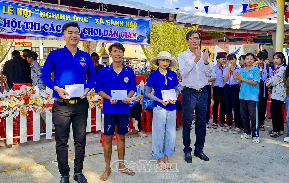 Đồng chí Nguyễn Huy Dũng, Bí thư Đảng uỷ, Chủ tịch HĐND xã Gành Hào, trao thưởng cho các tập thể, cá nhân đoạt giải tại các trò chơi dân gian.
