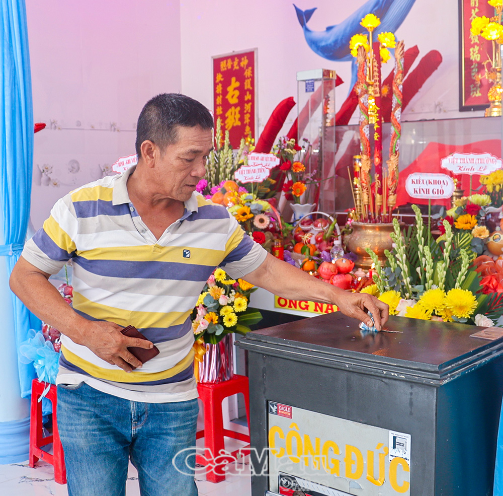Ngư dân thành kính đóng góp kinh phí vào hòm "Công đức" tại Lăng Ông Nam Hải (xã Gành Hào).