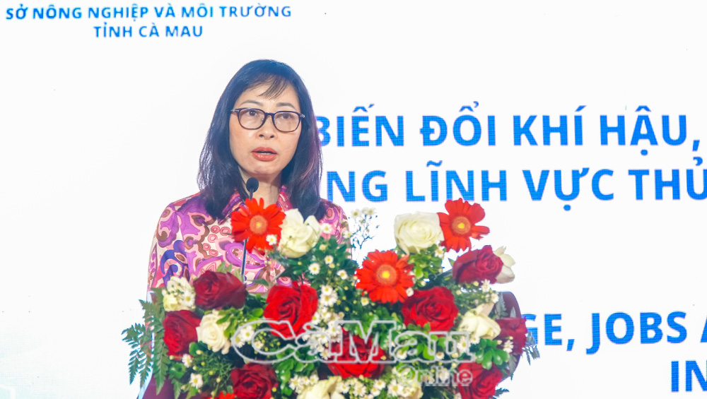Tiến sĩ Trương Thị Thu Trang, Phó Viện trưởng Viện Chiến lược, Chính sách Nông nghiệp và Môi trường trình bày tham luận về "Các phát hiện chính từ nghiên cứu định tính về thích ứng với biến đổi khí hậu, việc làm và sinh kế của lao động trong lĩnh vực thuỷ sản ở Đồng bằng sông Cửu Long".
